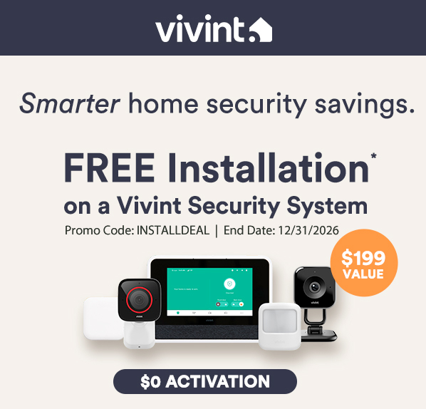 Qualifying system purchase requires minimum $599.99 equipment purchase and applicable services agreement. Click here for monthly service plan prices. Equipment purchase may be financed subject to an agreement with one of Vivint's financing partners. Offer not available in all states or provinces. Monthly $1.48 cellular network maintenance fee applies. Taxes and local permit fees may apply. New Vivint Customers only. Promo Code: INSTALLDEAL | End Date: 12/31/2026